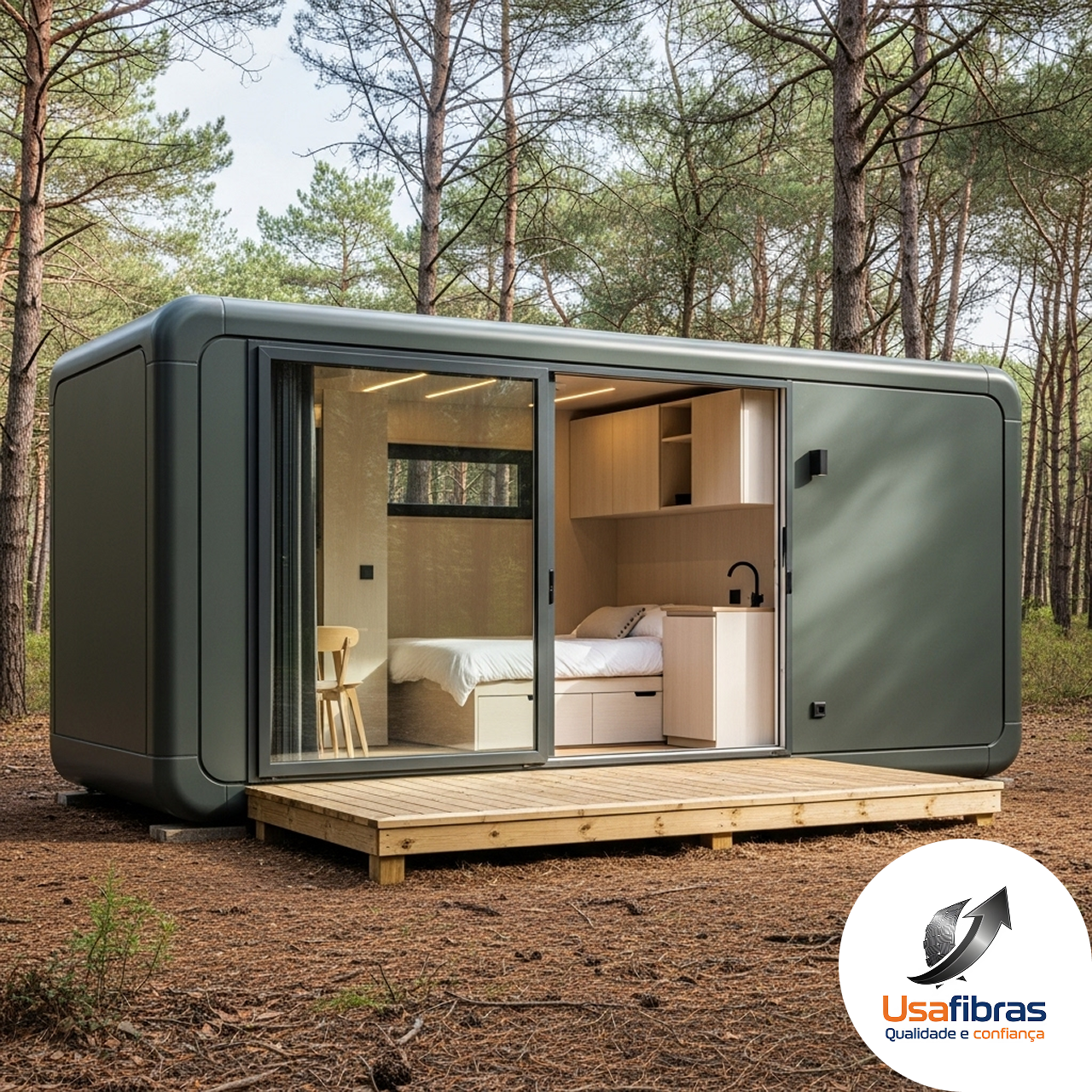 Descubra a inovação em hospedagem. As Cápsulas de Fibra USA Fibras unem design futurista, conforto de alto padrão e integração total com a paisagem.