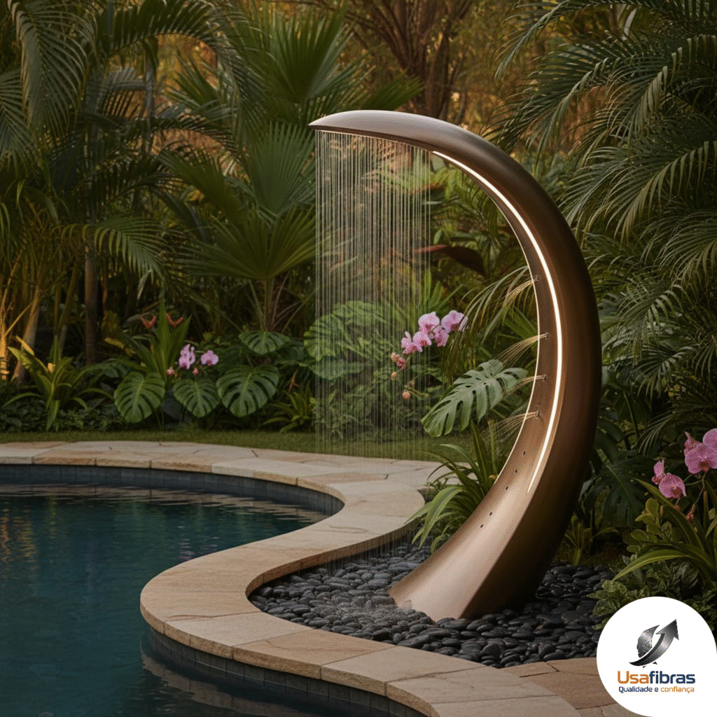 Nós transcendemos o conceito de “chuveiro” para criar uma peça arquitetônica em fibra. Desenvolvemos chuveirões que são verdadeiras esculturas de alto design, criadas para se harmonizar com a sofisticação da sua área de lazer.