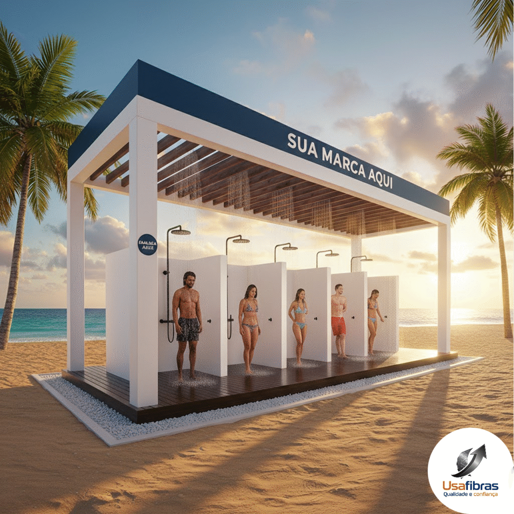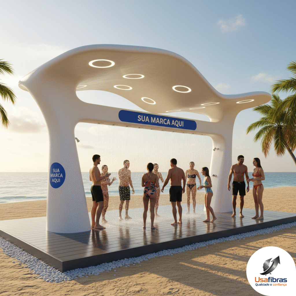 Design Personalizável: A fibra permite total liberdade de design, cores e formatos, integrando sua marca de forma criativa e impactante à estrutura do chuveirão.
